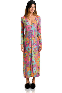 Introducing The Sable Starr Granny Dress, boasting a 1960's-inspired striped print adorned with hand-drawn stars for a touch of pizzazz. This versatile piece functions as both a button-up dress and an opened robe, exuding an air of sophistication thanks to its mother of pearl buttons and plunging neckline. Meticulously crafted from a sumptuous stretchy jersey fabric, it is the epitome of edgy elegance for any event.